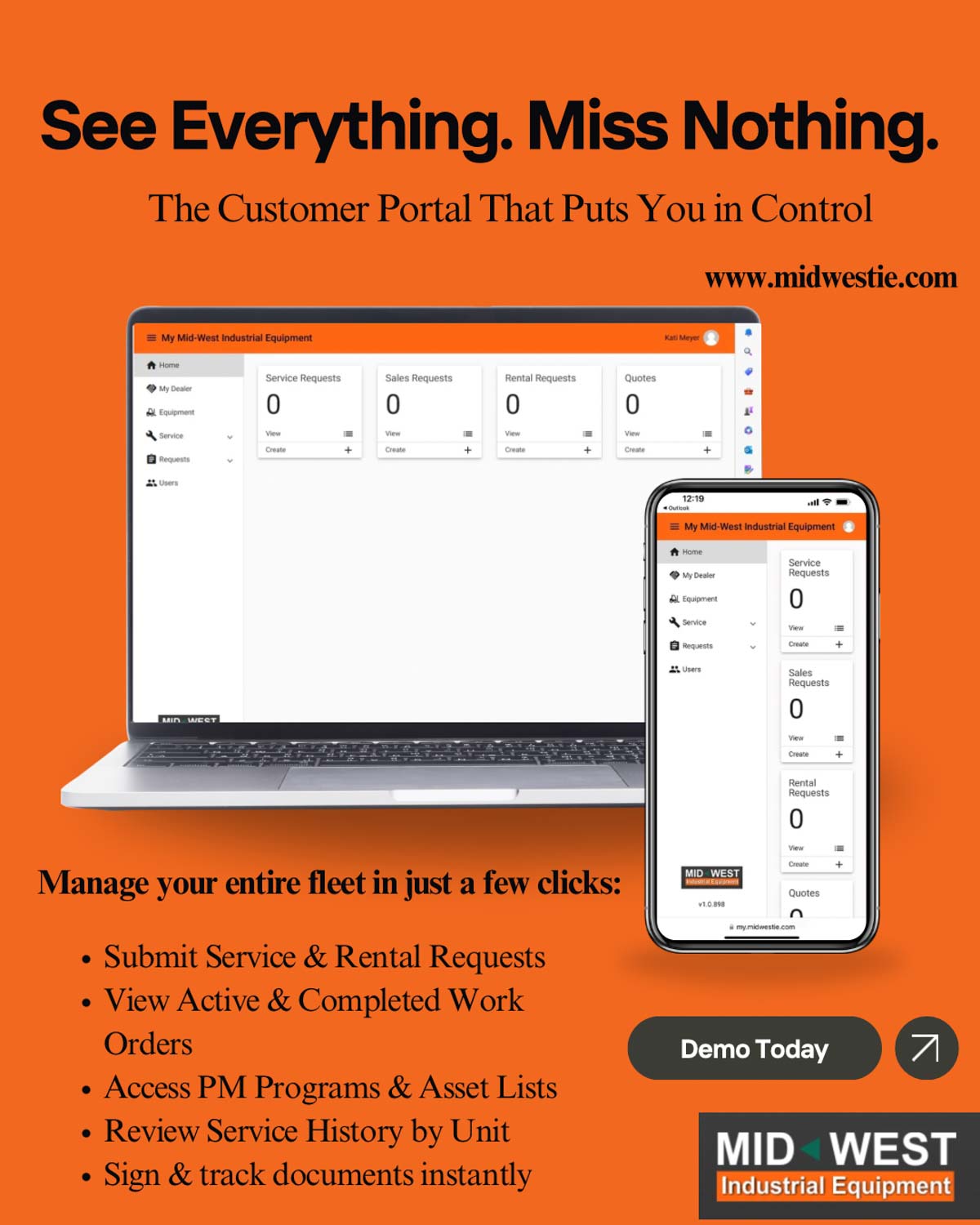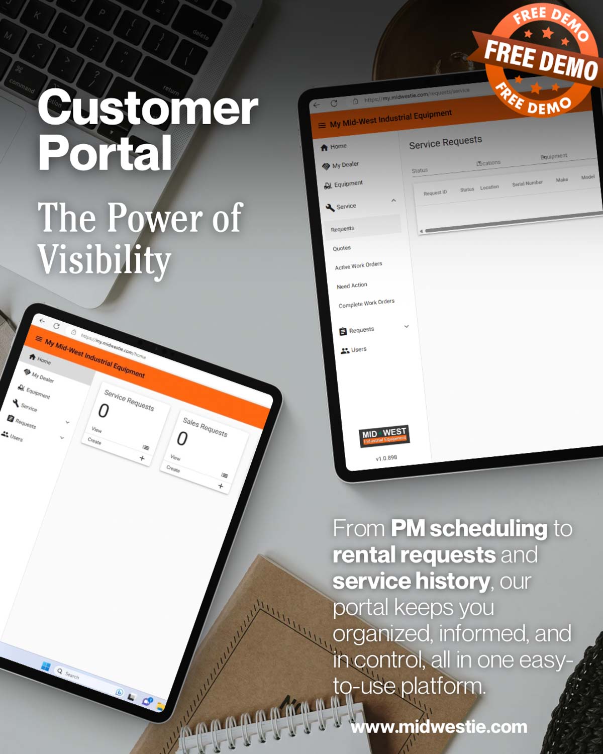 Our customer portal gives you full visibility into your equipment and service—anytime, anywhere. Submit service requests, track progress, and access important information all in one convenient place. And best of all, it’s completely free.